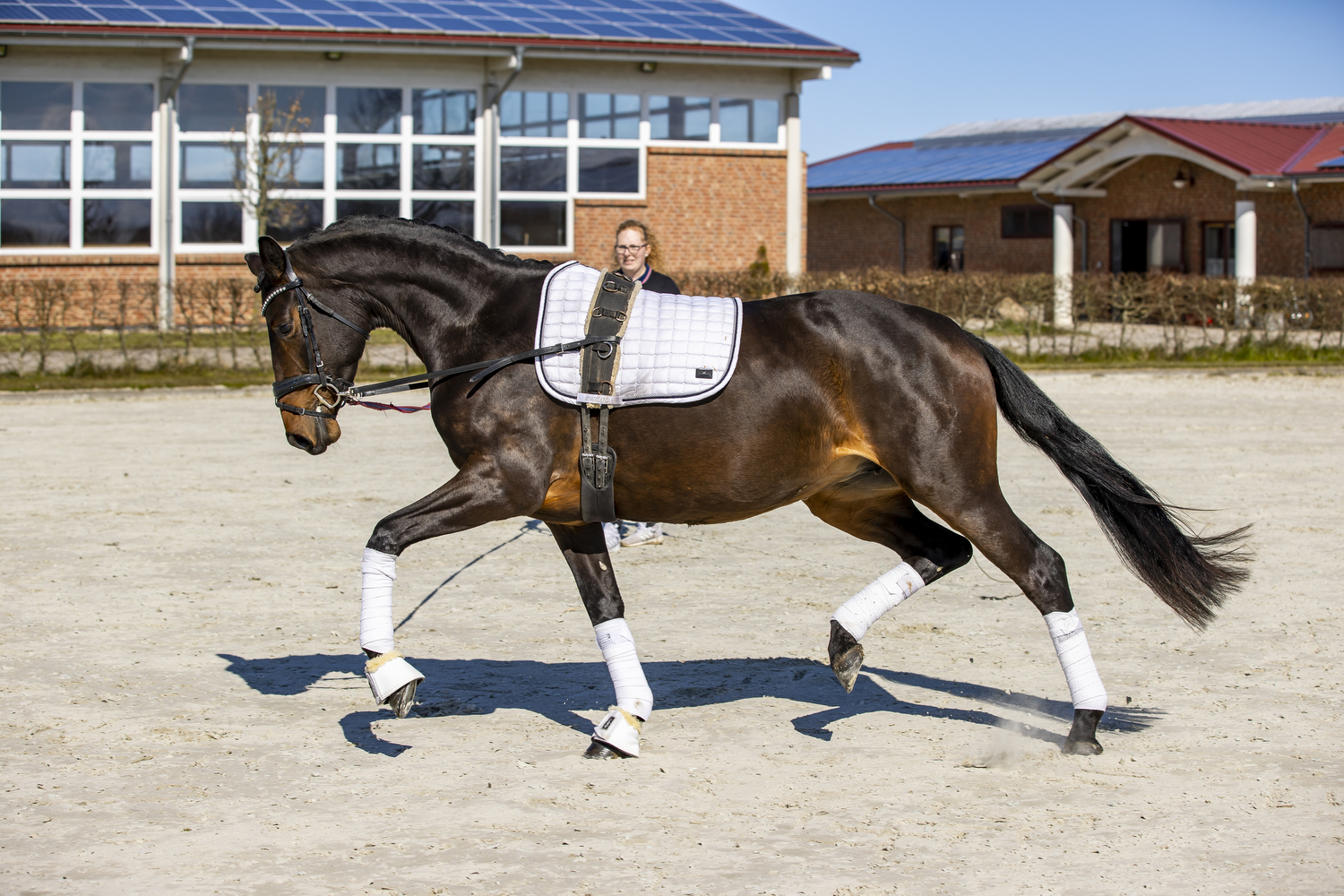 Das Programm der Dressurausbildung des Gestüts Brodersdorf reicht vom Anreiten bis zu Prüfungen der Klasse S, wobei neben Weide, beziehungsweise Paddock auch Abwechslungen durch disziplinübergreifende Inhalte, wie Freispringen, Doppellonge oder Gelände immer wieder mit eingebaut werden.