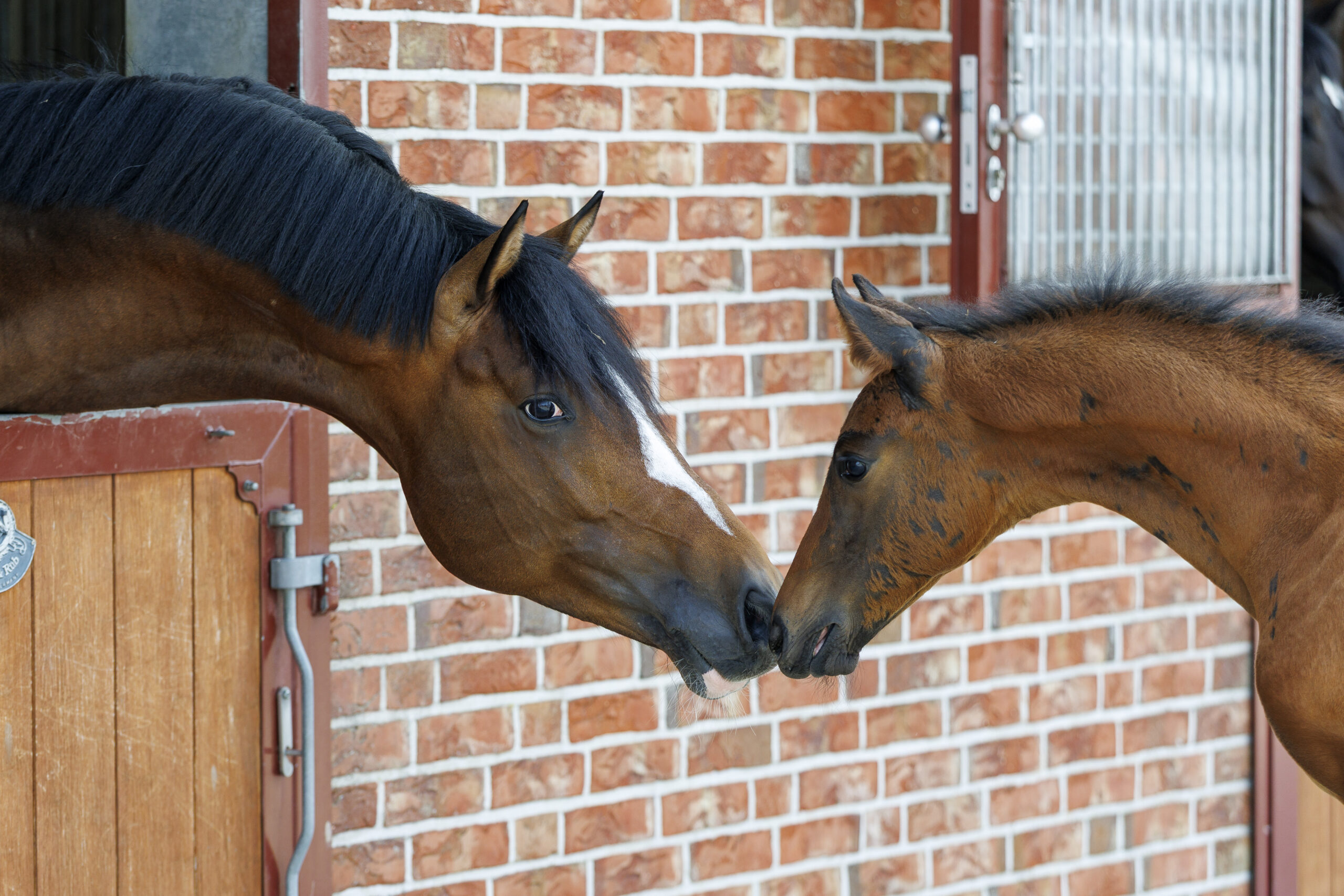 Hier in neugieriger Annährung von Vater und Sohn ein 2025 geborenes Hengstfohlen von Rockingham aus der Fayola (v. Fürst Romancier – Jazz Time – De Niro).