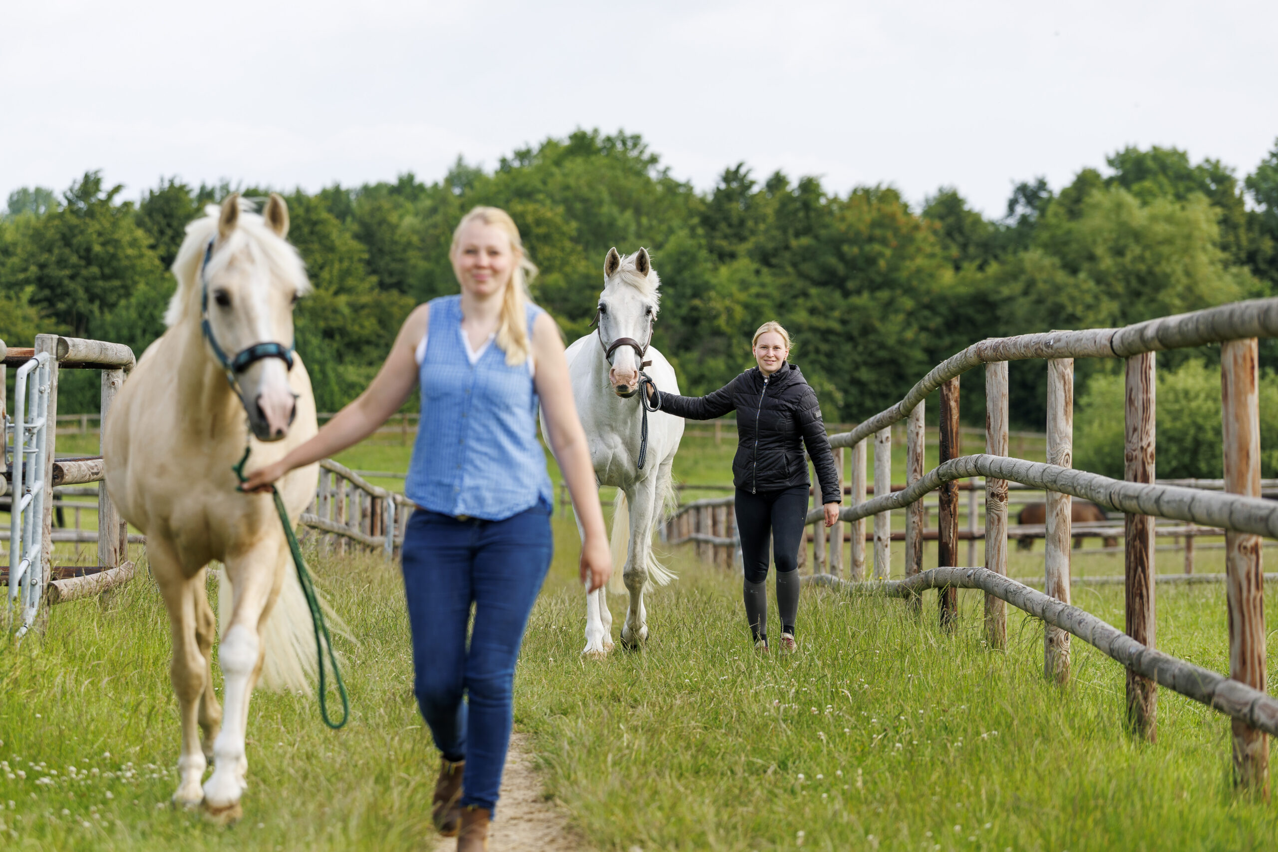 Täglich erhalten alle Pensionspferde Auslauf je nach Witterung auf den Paddocks oder auf den Hausweiden. Dabei teilen sich meist mehrere Pferde eine Weide.