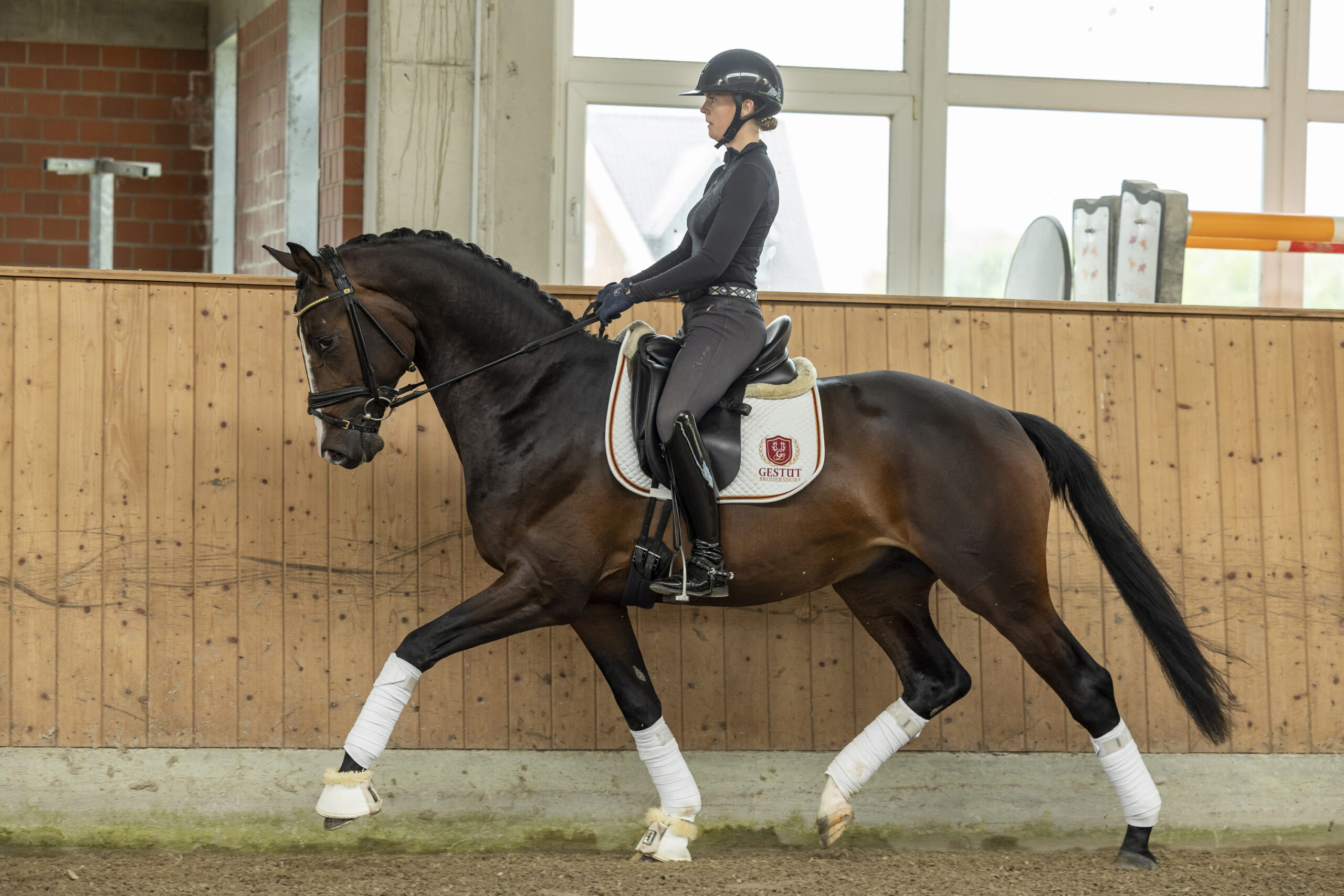 Auch die Arbeit mit jungen Pferden gehört zum Schwerpunkt der Ausbildung in Brodersdorf. Schon drei Mal erhielt eine Stute aus Brodersdorf die bundesweit jahresbeste Benotung in einer Trakehner Feldprüfung: Sublime (v. Millennium) 2020, I-Catcher (v. Millennium) 2022 und Holiday (v. Schwarzgold) 2024.